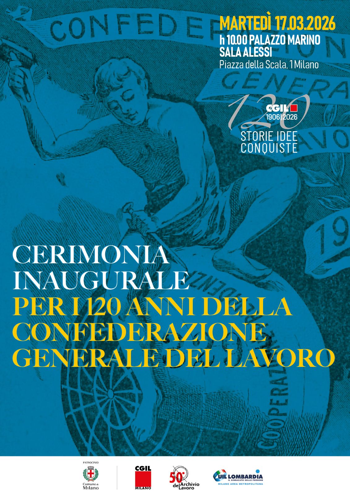 Martedì 17 marzo 2026, alle ore 10.00, nella Sala Alessi di Palazzo Marino (Piazza della Scala 1, Milano), si terrà la cerimonia inaugurale per i 120 anni della Confederazione Generale del Lavoro (1906–2026).