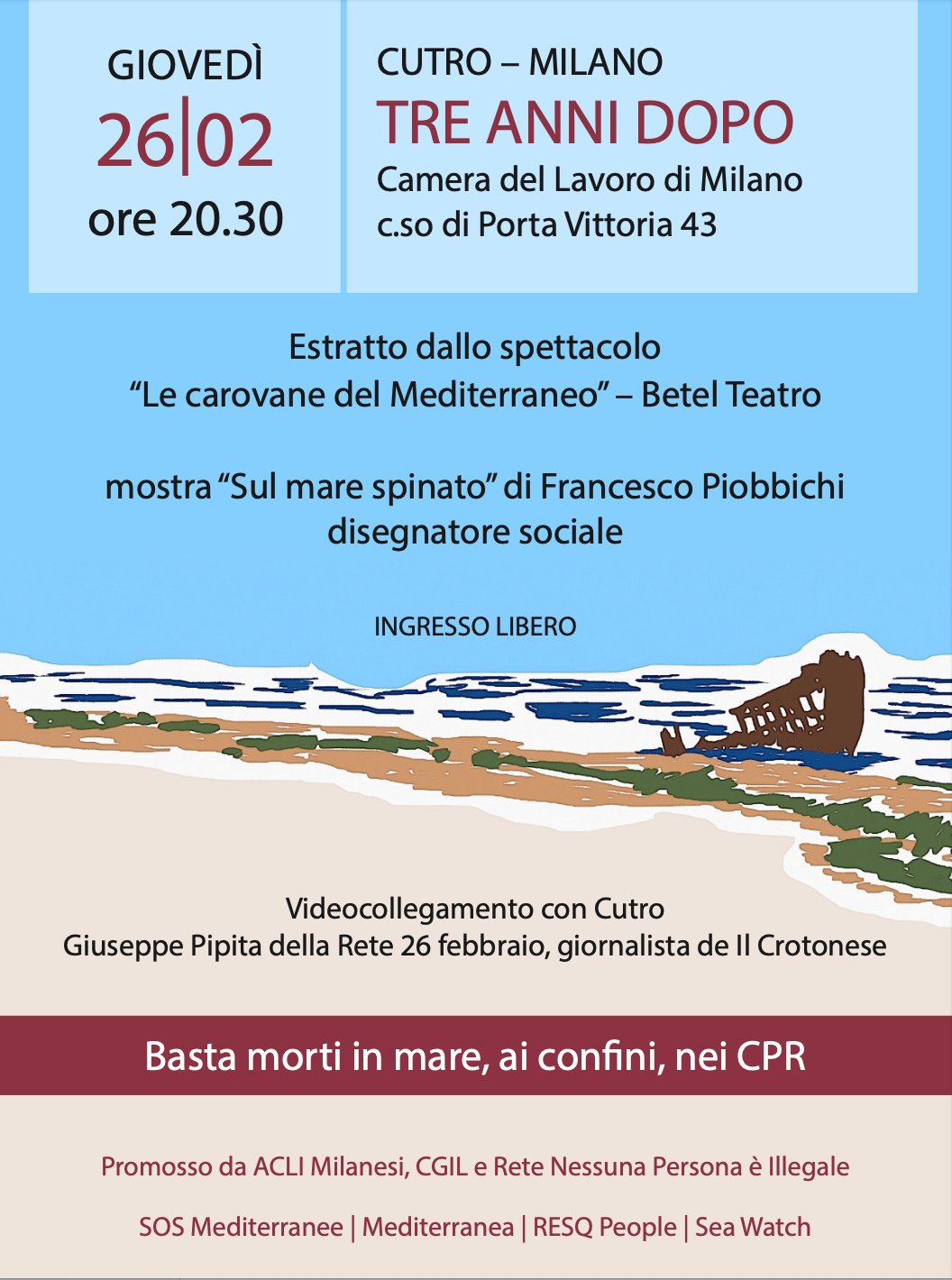 Giovedì 26 febbraio alle ore 20.30 si terrà “Cutro – Milano. Tre anni dopo”, un’iniziativa promossa da ACLI Milanesi, CGIL e Rete Nessuna Persona è Illegale, con l’obiettivo di mantenere viva la memoria delle vittime del naufragio avvenuto sulle coste calabresi il 26 febbraio 2023 e rilanciare l’impegno per politiche migratorie fondate su diritti, legalità e umanità.
