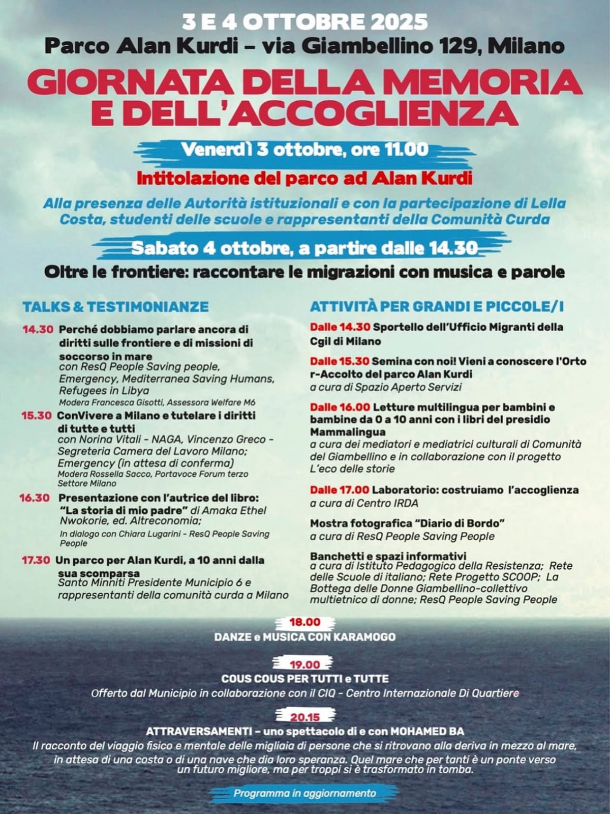 Giornata della Memoria e dell’Accoglienza Data 03 - 04 Ott 2025 Concluso Ora 11:00 Luogo Parco Alan Kurdi Via Giambellino 129 Cerca Ricerca per: Categorie Eventi Immigrazione Lavoro News Senza categoria Servizi