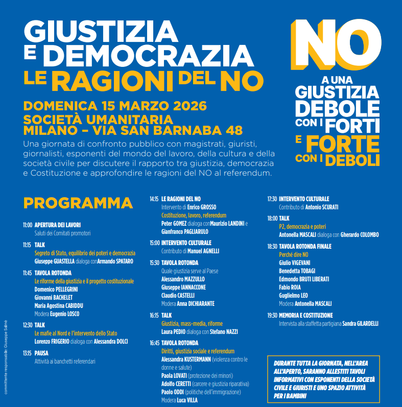 Giustizia e democrazia. Le ragioni del no + Aggiungi a Google Calendar + esporta iCal / Outlook Data 15 Mar 2026 Ora 10:00 Luogo Società Umanitaria Via San Barnaba 48, Milano Cerca Ricerca per: Categorie Eventi Immigrazione Lavoro News Senza categoria Servizi
